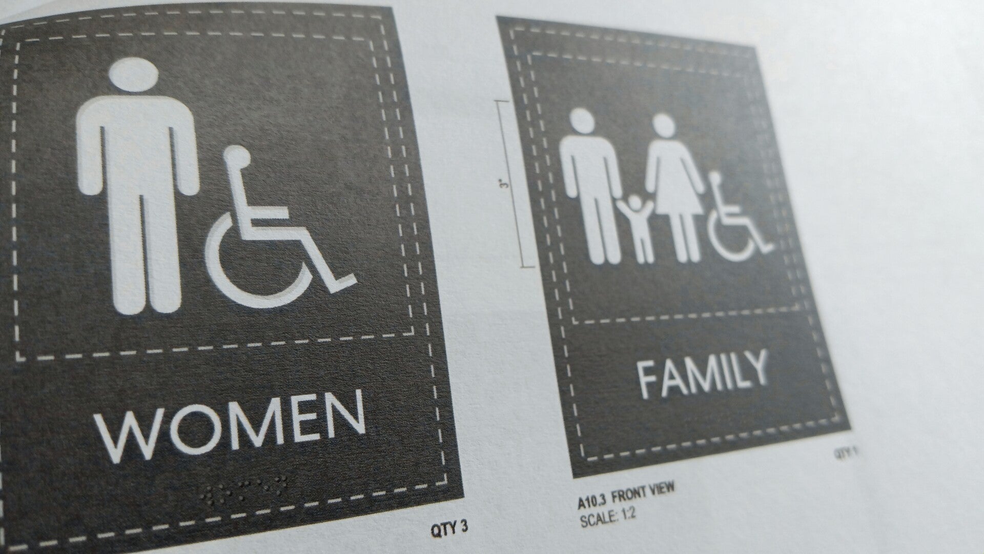 Environment — A studio or office setting with signage samples in the background (e.g., directional signs, storefront mockups, ADA-compliant examples).